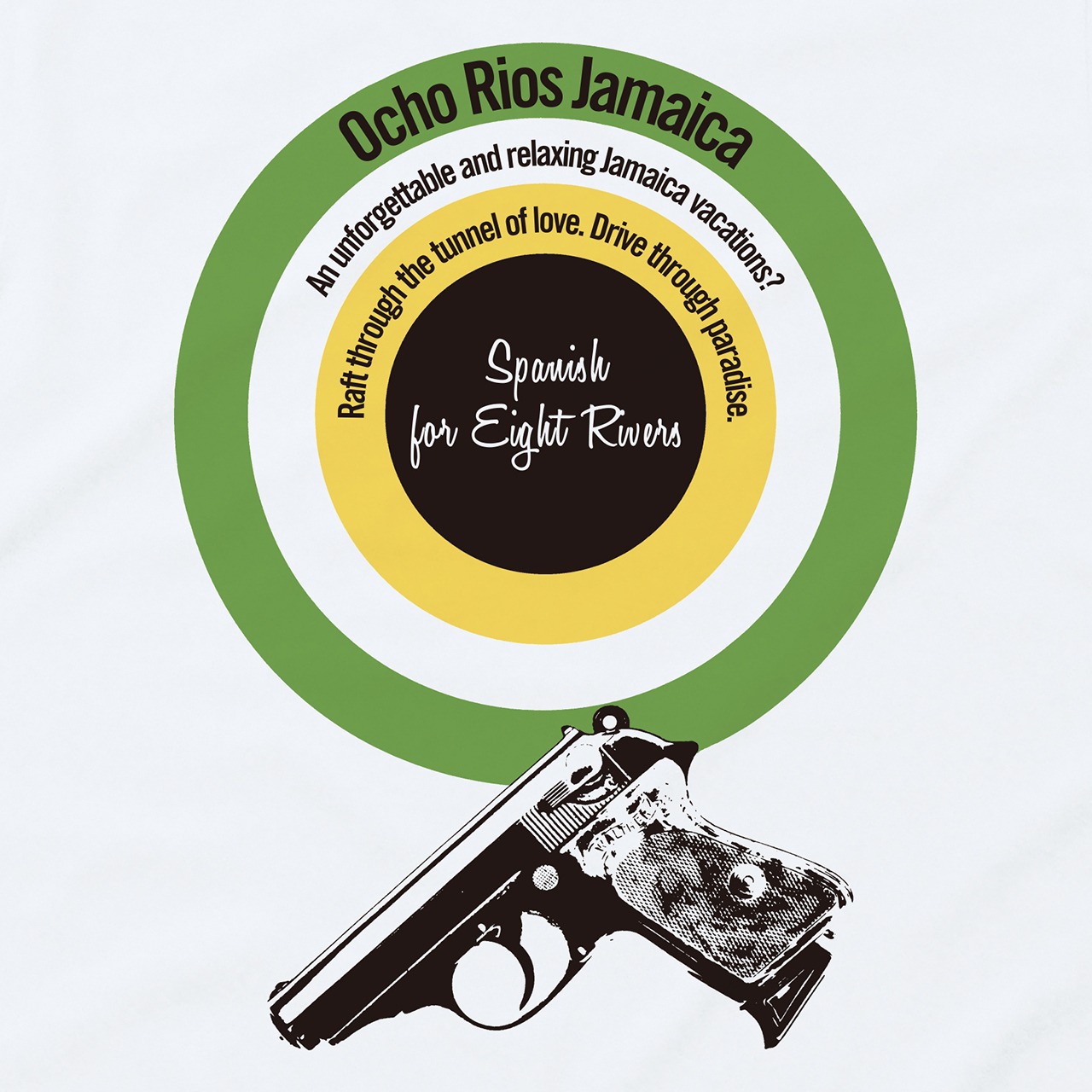 ジャマイカをテーマにヴィンテージテイストなカラーリングと映画でおなじみの小型セミオートマチック拳銃を組み合わせたムービーポスターテイストの強いデザインに仕上げてみました。